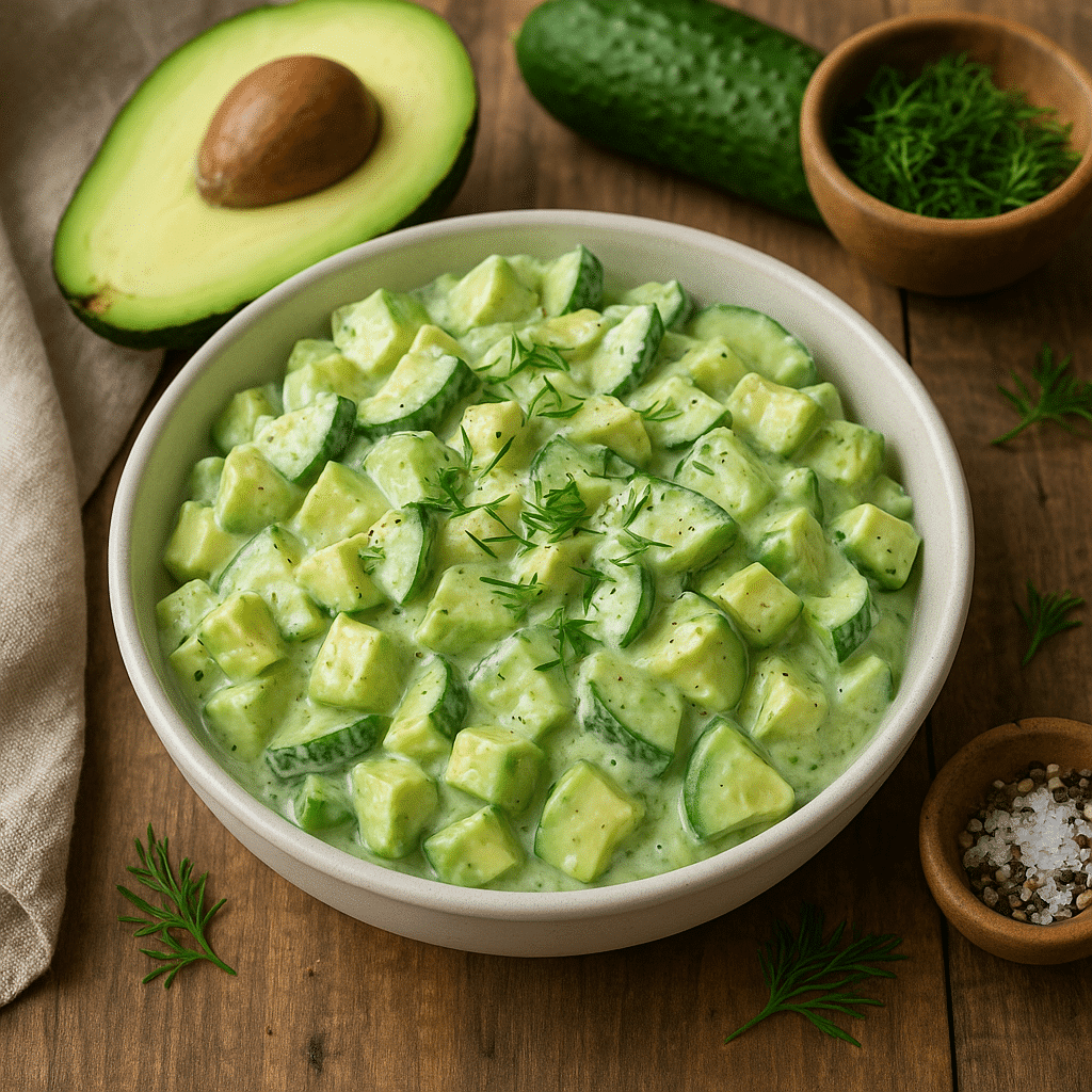 - Vend avocado og agurk forsigtigt i yoghurtdressingen, så det bliver godt dækket.