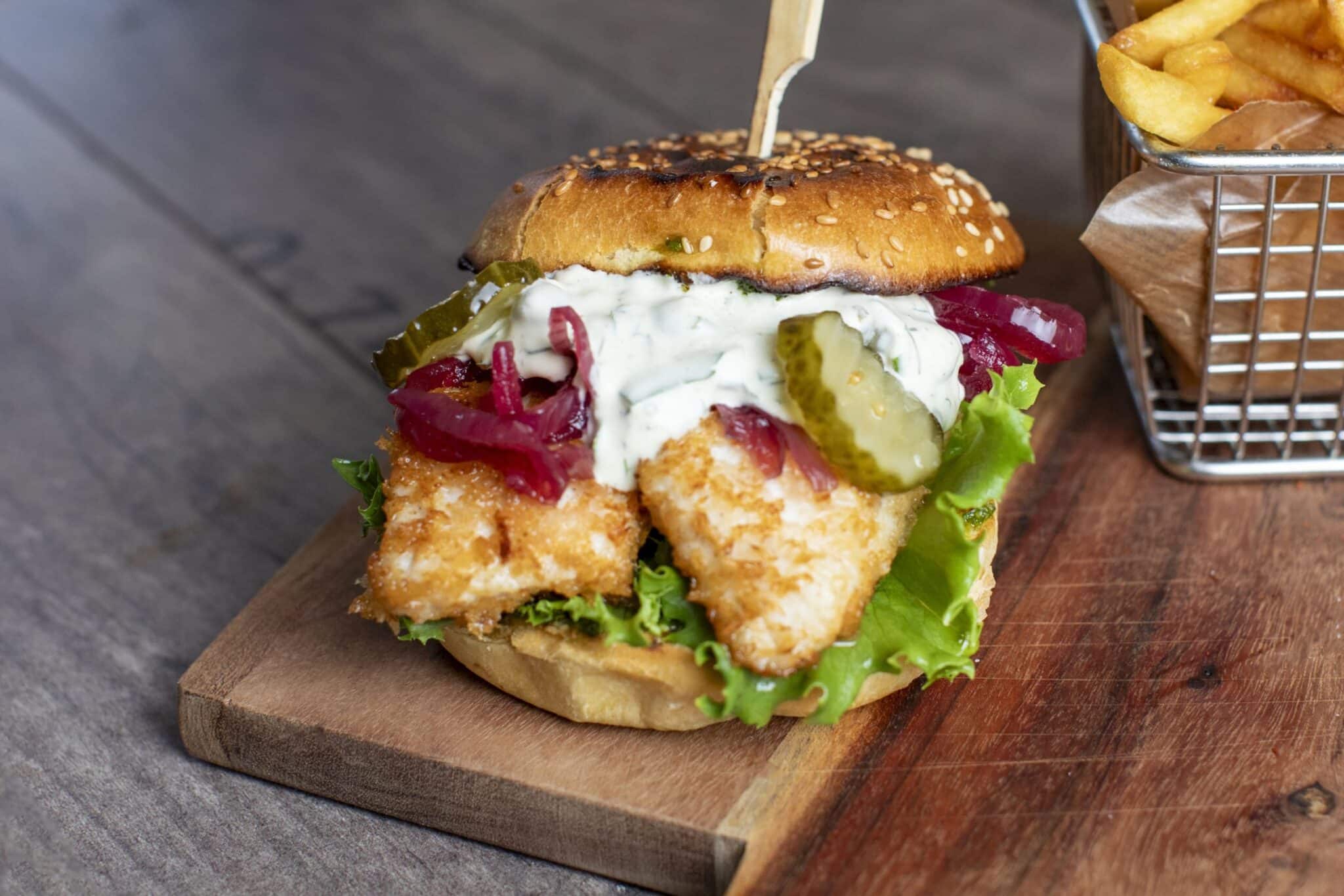 Saml burgeren med salat, fiskefilet, syltede agurker, syltede rødløg og en stor skefuld urtedressing.