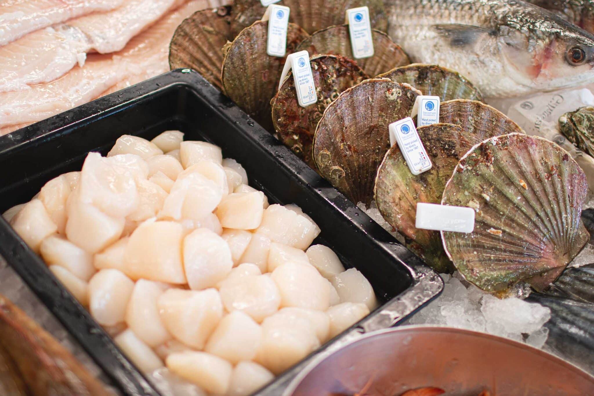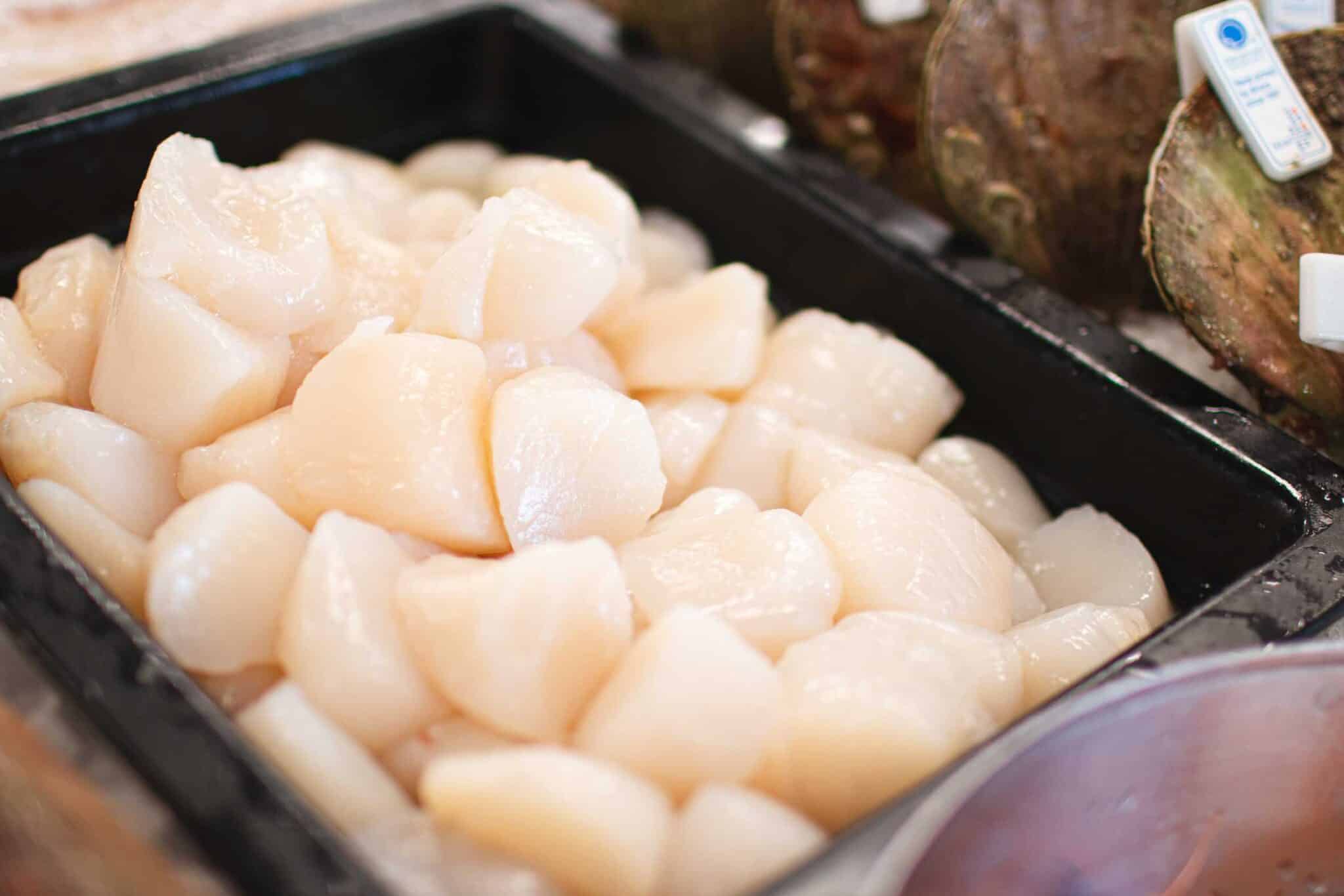 Kammuslingerne (uden skal) ligger på løsfrosne i 800 g poser og kan anvendes lidt ad gangen.