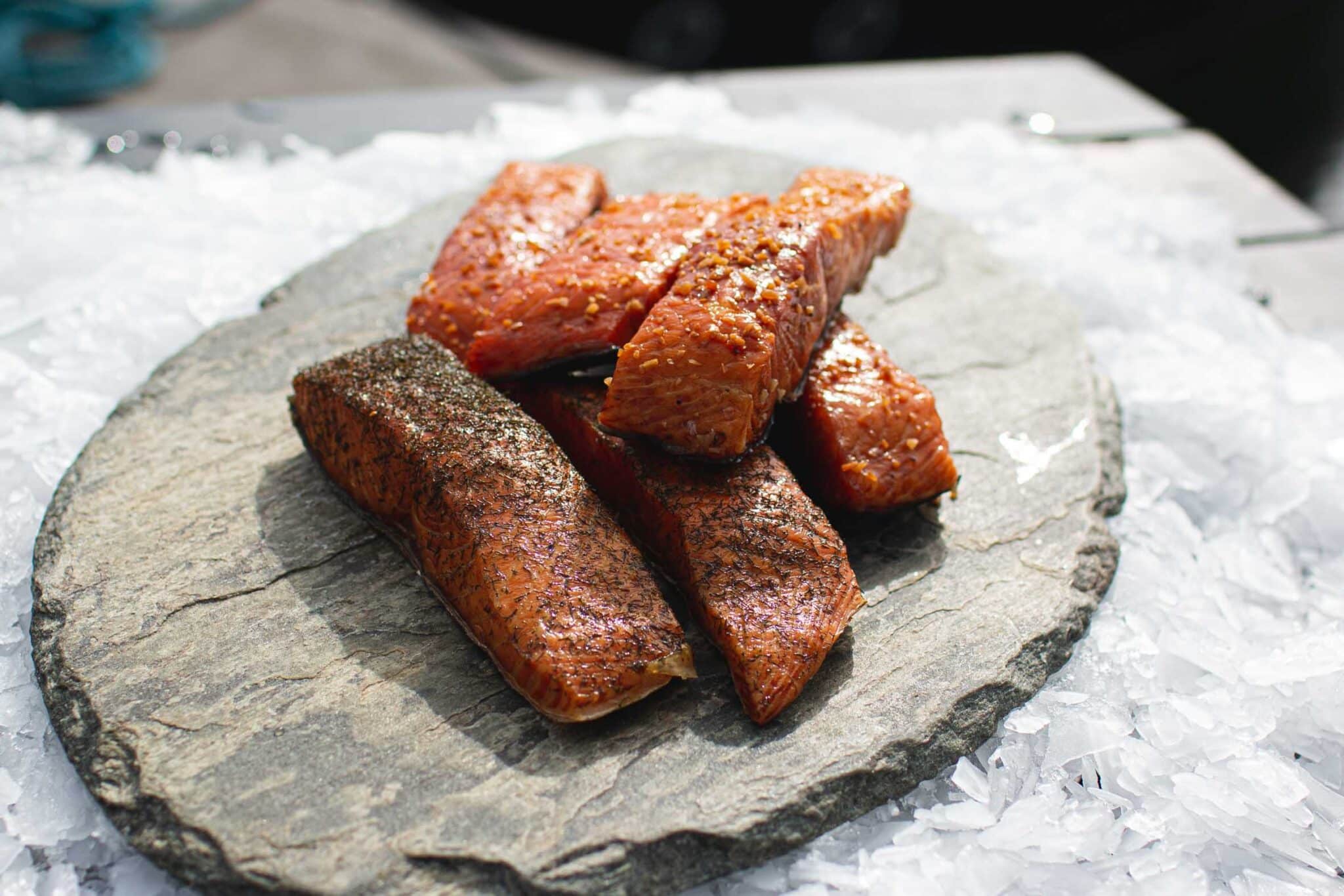 Vi røger laksesnitterne med forskellige krydderier, og du kan vælge mellem neutral (uden topping), hvidløg, paprika, paprika/hvidløg, hvidløg og peberblanding.